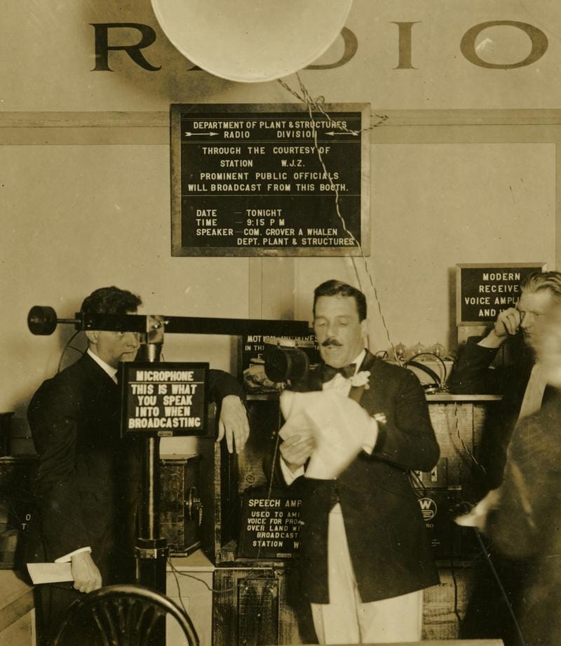 In the center you see WNYC’s father figure, NYC’s Commissioner of Public Works Grover Whalen, giving a demo broadcast before the station even existed (the city rented some time on WJZ).