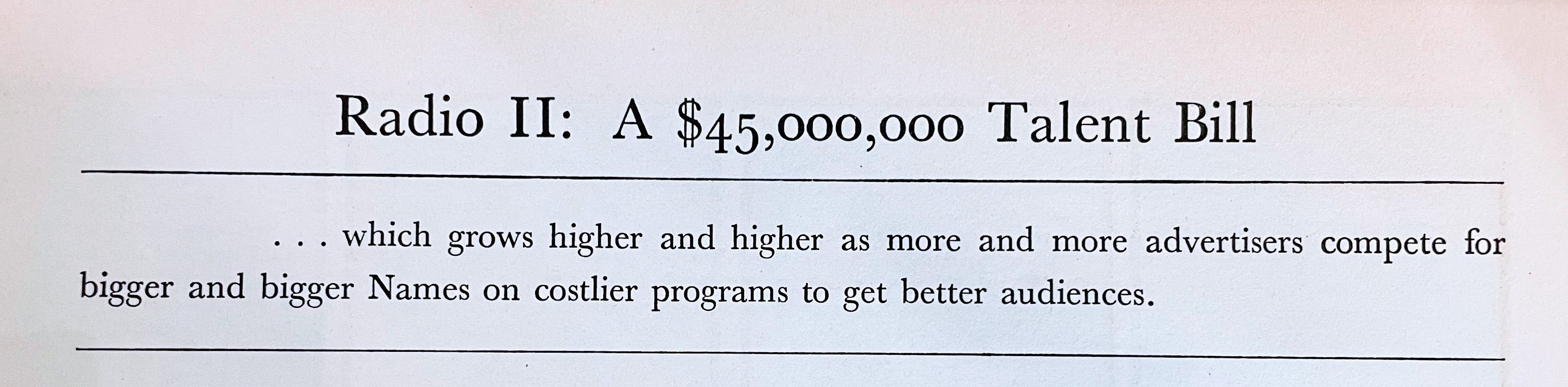 The Fortune article starts with a tongue-in-cheek emblematic scenario that’s incredible once you understand the numbers involved. A toothbrush manufacturer wants to sponsor primetime network entertainment as a way to make a dent in the market. The hapless toothbrush guy is talked by his advertising agency into approving ever more costly radio bills starting with $2000 weekly (almost $47,000 today) for the show’s star talent; and $1000 for two scriptwriters. Then there are supporting comic actors, a sound-effects team, and musicians: an 18-piece orchestra plus conductor. Toothbrush guy also needs to pay for a program director and an announcer to set up the show and shill the sponsor’s brand. In the end, with the network fees, he’s paying close to $13,000 ($304K+) a week for a show he doesn’t really like — but he says nothing and signs all the checks, earning the moniker “Fairy Godfather.”
