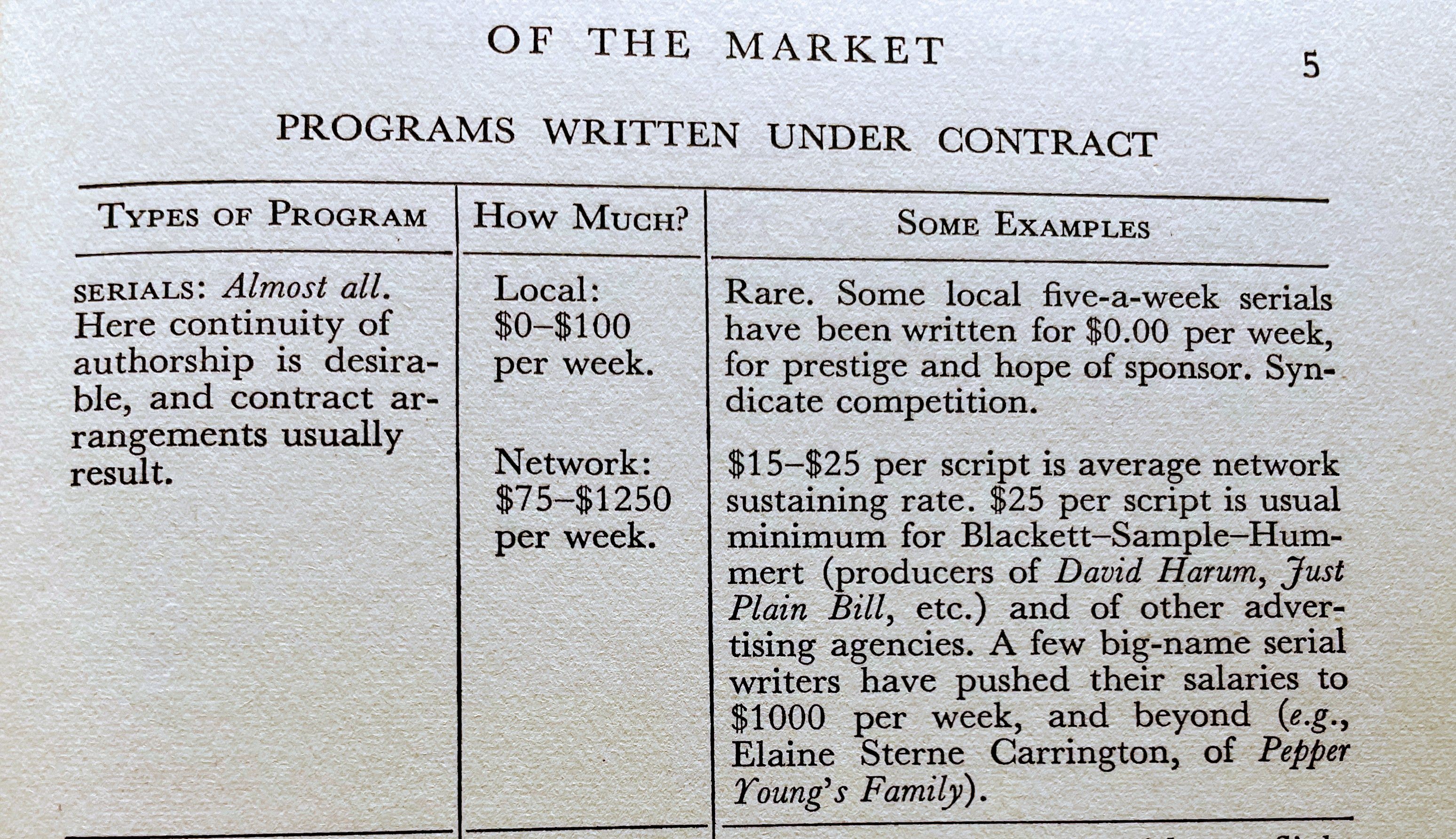 Barnouw’s Handbook, published in 1939 when he was fresh out of the radio business, starts off with the practical stuff right away: how much can a writer make in this industry?